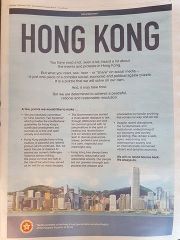 The Hong Kong government has taken out an advertisement overseas in Australia as it seeks to reassure investors the city is stable and the economy is strong, according to a Bloomberg report.