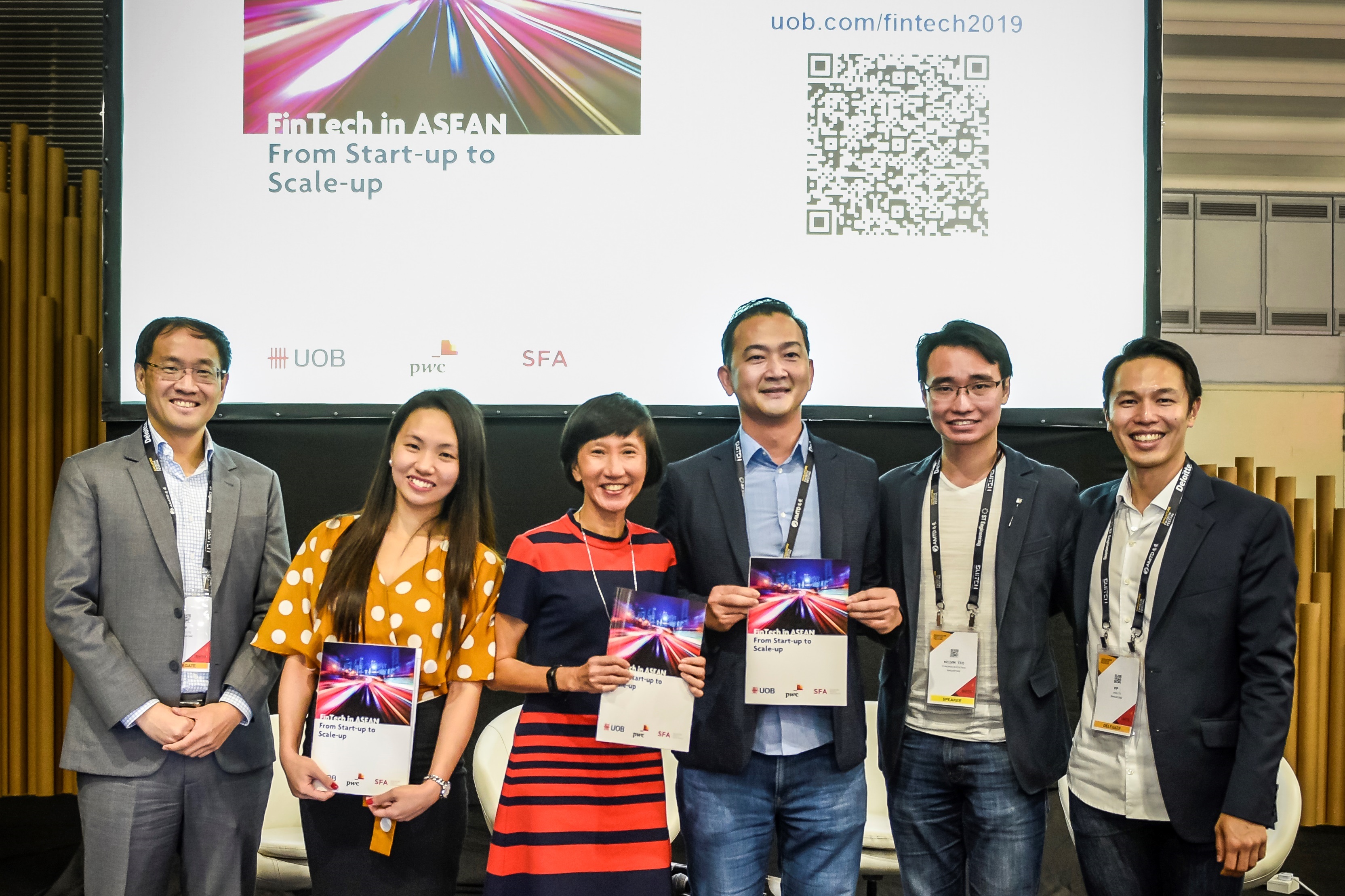 Ms Janet Young, Head of Group Channels and Digitalisation, UOB; Ms. Wong Wanyi, FinTech Leader of PwC Singapore; Mr. Chia Hock Lai, President of SFA; Mr. Charles Wong, Chairman and Co-Founder, Prive Technologies; Mr. Kelvin Teo, Chairman and Group CEO, Funding Societies and Mr. Rueben Lai, Senior Managing Director, Grab Financial Services, together launched the report at Singapore FinTech Festival x SWITCH 2019 on Tuesday (Nov 12).