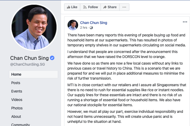 “There have been many reports this evening of people buying up food and household items at our supermarkets… I understand that people are concerned after the announcement this afternoon that we have raised the DORSCON level to orange,” said the Minister in his post.