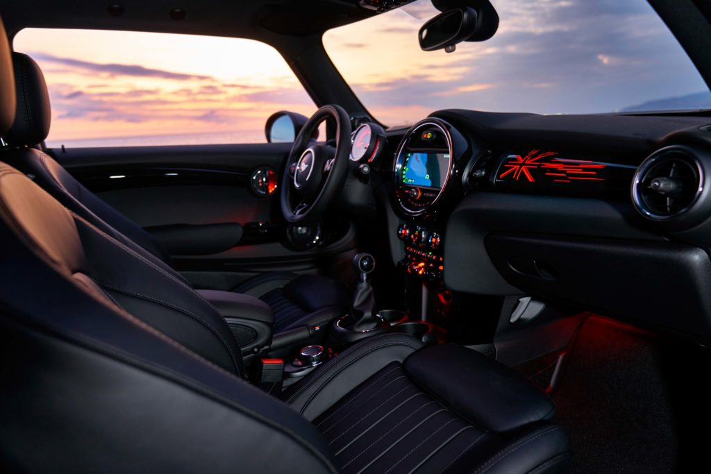 In addition, the option MINI Yours Interior Style Piano Black is now available with illumination. As well as surfaces in the area of the doors and centre console finished in Piano Black, this also includes a rear-lit decorative strip for the instrument panel on the passenger side. The latter is likewise finished in Piano Black as well as bearing a stylised Union Jack motif. The colour of the background lighting for the decorative strip is the same as the mood of the ambient lighting selected by the driver as part of the MINI Excitement Package.