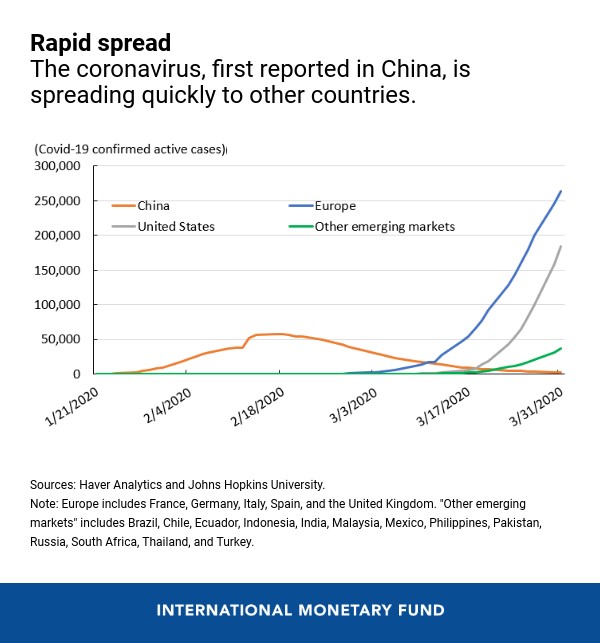 China was the first country to experience the full force of the disease, with confirmed active cases at over 60,000 by mid-February. European countries such as Italy, Spain, and France are now in acute phases of the epidemic, followed by the United States where the number of active cases is growing rapidly. In many emerging markets and developing economies, the epidemic appears to be just beginning, it says.