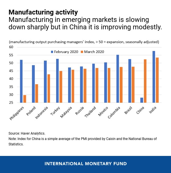 After showing little movement early in the year, the latest indices from purchasing manager surveys (PMIs) are pointing to sharp slowdowns in manufacturing output in many countries, reflecting drops in external demand and growing expectations of declining domestic demand. On a positive note, China is seeing a modest improvement in its PMI after sharp declines early in the year, despite weak external demand, the IMF blog says.