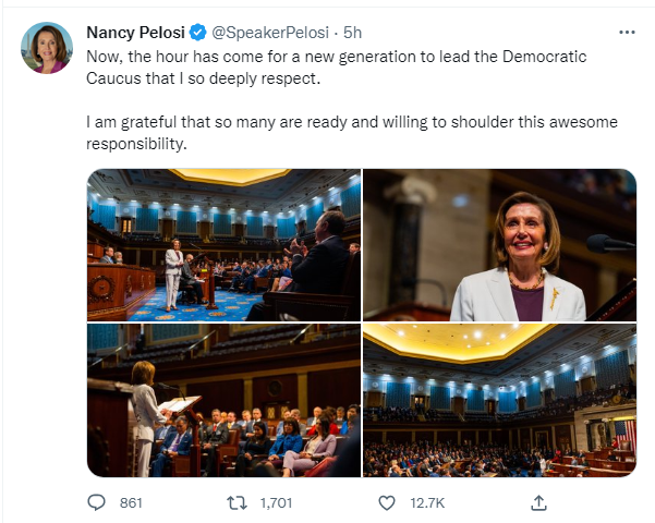 A New York Times report says that her decision represented a transformative moment for House Democrats, and it set off a rapid and long-anticipated shift in the top ranks of Democratic leadership — now dominated by a trio of octogenarians — toward a younger group that has been waiting in the wings.