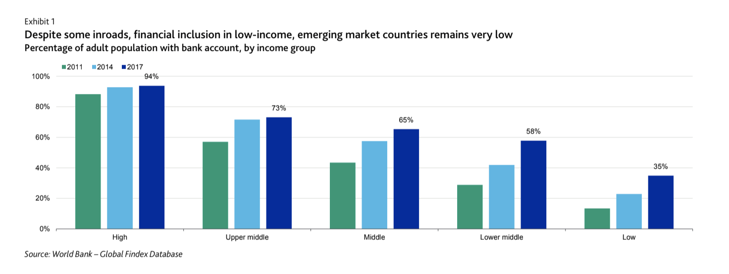 According to the report, numerous countries remain severely underbanked despite significant progress in recent years. In fact, the percentage of adults with a bank account in low-income and lower middle-income countries was 35% and 58% respectively as of 2017. This contrast is more obvious when compared to a level of 94% in high-income countries.