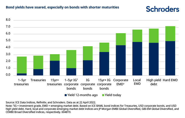 This time last year, short-dated US Treasuries yielded only 0.1%. Today they yield 2.7%, as the market has priced in a series of aggressive interest rate hikes from the Federal Reserve. Longer-dated yields have also risen, but not by as much, from 2.1% to 3.1%. These figures are for 1-5 year maturity bonds and over-15 year maturity bonds, respectively.