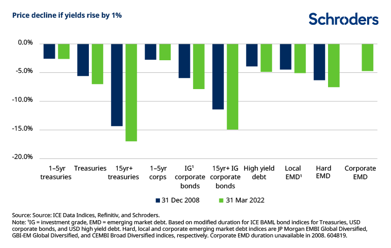 One of the most important trends in bond markets over recent decades has been the increased sensitivity of prices to movements in yields. In 2008, if the entire Treasury yield curve shifted up by 1%, investors in the broad Treasury market would see the value of those investments fall by around 5.6%. Today that figure would be 7.0%.