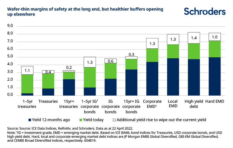 Longer-dated corporate bonds continue to have a bit more of an advantage over shorter-dated ones, but that has narrowed considerably. And, at current levels, shorter-dated bonds can also stomach a much larger rise in yields before being vulnerable to losses. As can high yield and emerging market debt – although they come with additional credit and currency risks.