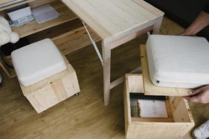The units have large windows and come with “multi-functional furniture”, including a sofa bed, foldable table and chairs which double as storage spaces. Multi-functional stools that can also be used as storage spaces or a coffee tables and a table that folds away are some of the features in the house.