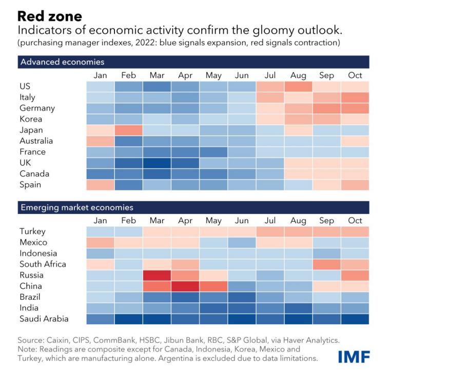 Gudmundsson said as the chart illustrates, readings for a growing share of G20 countries have fallen from expansionary territory earlier this year to levels that signal contraction. That is true for both advanced and emerging market economies, underscoring the slowdown’s global nature.