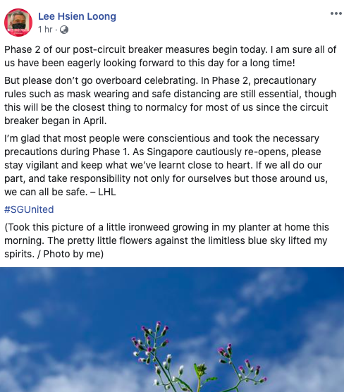 He delivers the message in a Facebook post as the Republic’s Phase 2 of post-circuit breaker measures begin today.
