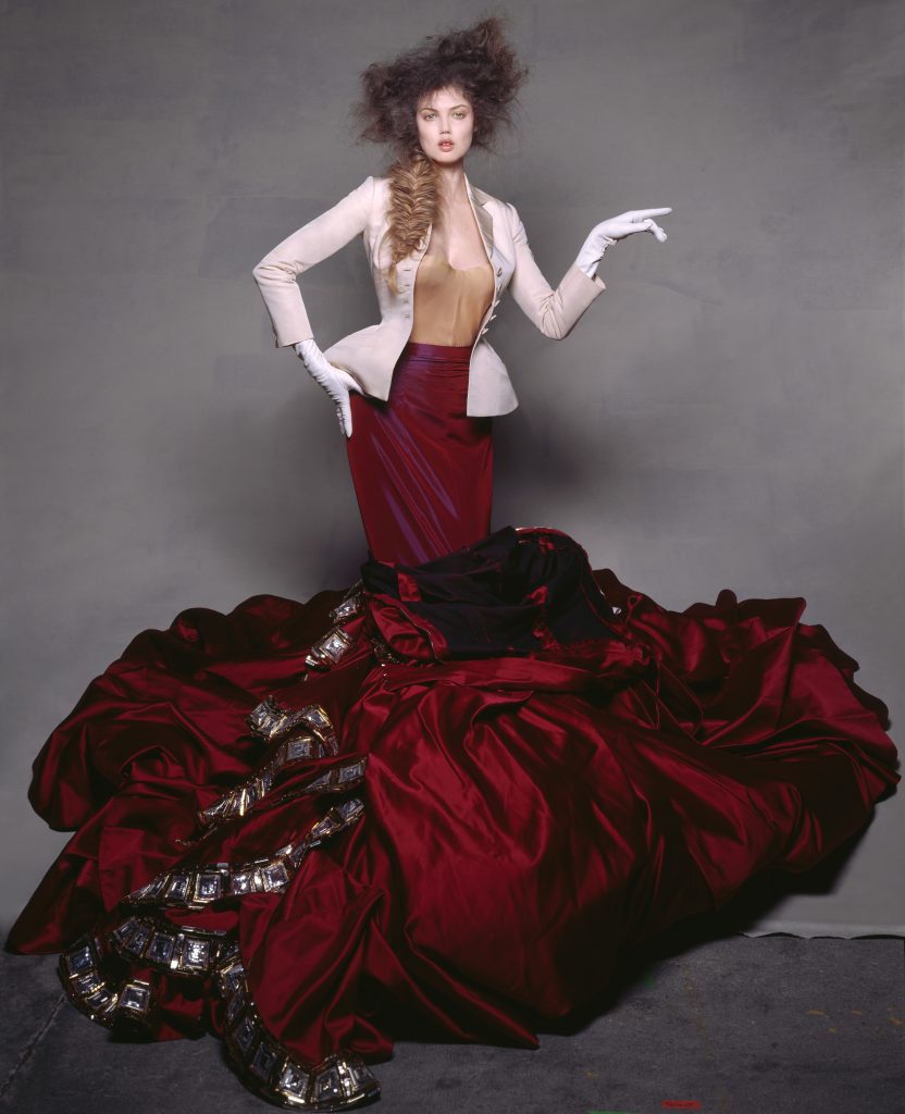 Christian Dior Bar jacket in ecru shantung. Haute Couture Spring-Summer 1947 Christian Dior by John Galliano Dress in red satin embroidered with gold and silver beads and paillettes with rhinestone jewelry. Haute Couture Autumn-Winter 2004 Dior Héritage collection, Paris Concept and photography by Brigitte Niedermair