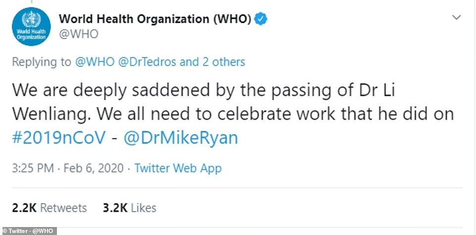 Dr. Li was reportedly becoming less active on social media in recent days. He liked an online poll on Weibo on Feb 3 about whether people were back to work after vacation.