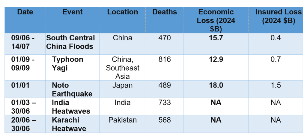 Flooding remained the leading cause of loss in 2024, with China experiencing particularly severe seasonal floods. Additionally, the Noto earthquake in Japan and Typhoon Yagi—one of the most destructive storms to strike Southeast Asia since Typhoon Rammasun in 2014—contributed substantially to the year’s damage tally. Typhoon Yagi affected multiple countries, including Vietnam, China, Myanmar, the Philippines and Thailand, demonstrating the compounded impact of wind and flood risks in typhoon-prone regions.
