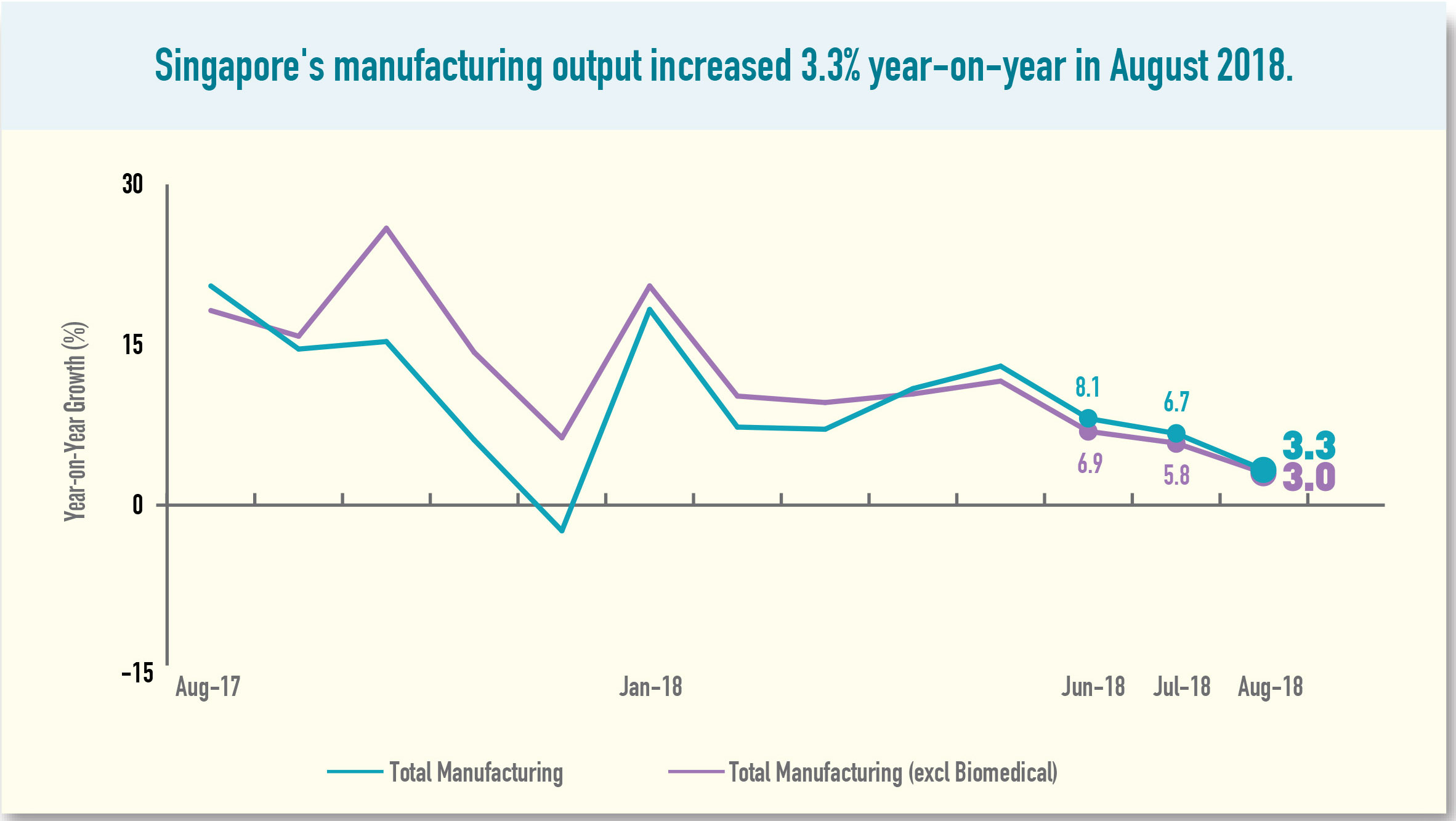 Singapore’s manufacturing output increased 3.3 per cent in August 2018 from a year ago, according to figures released by the Economic Development Board (EDB) on at Sep 26. On a month-on-month basis, manufacturing output decreased 2.0%. Excluding biomedical manufacturing, output fell 3.4%.