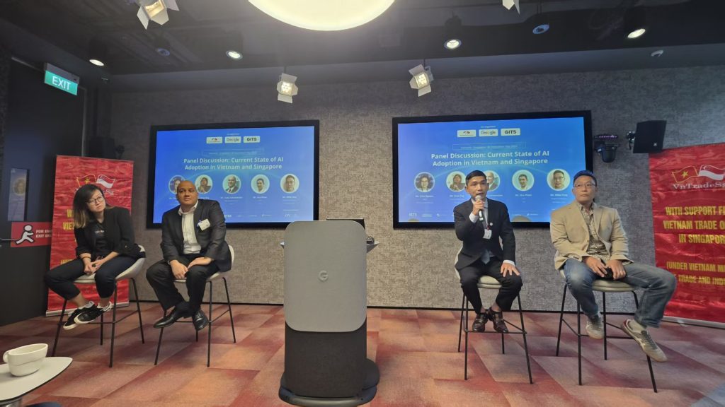The event also featured a panel discussion on the current state of AI innovation in Vietnam and Singapore, moderated by Ellen Nguyen of ICTS. Speakers included Mike Feng of Innowave Tech, Pham Thanh Huu of IVS, Sujey Subramanian of PAG Asia Capital, and Esna Ong of Google. Each brought perspectives from manufacturing, services, investment, and platform technology.