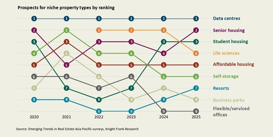 Investor appetite for defensive sectors remains strong, with data centres leading alternative real estate investments, despite anticipated rate cuts. Data centres have consistently ranked first in niche property type prospects, showcasing remarkable growth. In 2024, data centre investments reached US$6.3 billion (excluding the AirTrunk takeover) a 2.5-fold increase from US$2.5 billion in 2023. This trend is driven by persistent pricing expectation gaps and narrowing yield spreads, pushing investors towards assets that can meet their return targets.