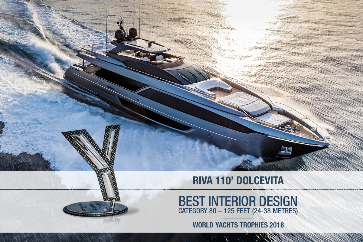 - Riva 110’ DolceVita: Best Interior Design Trophy, category 80 – 125 feet (24-38 metres).