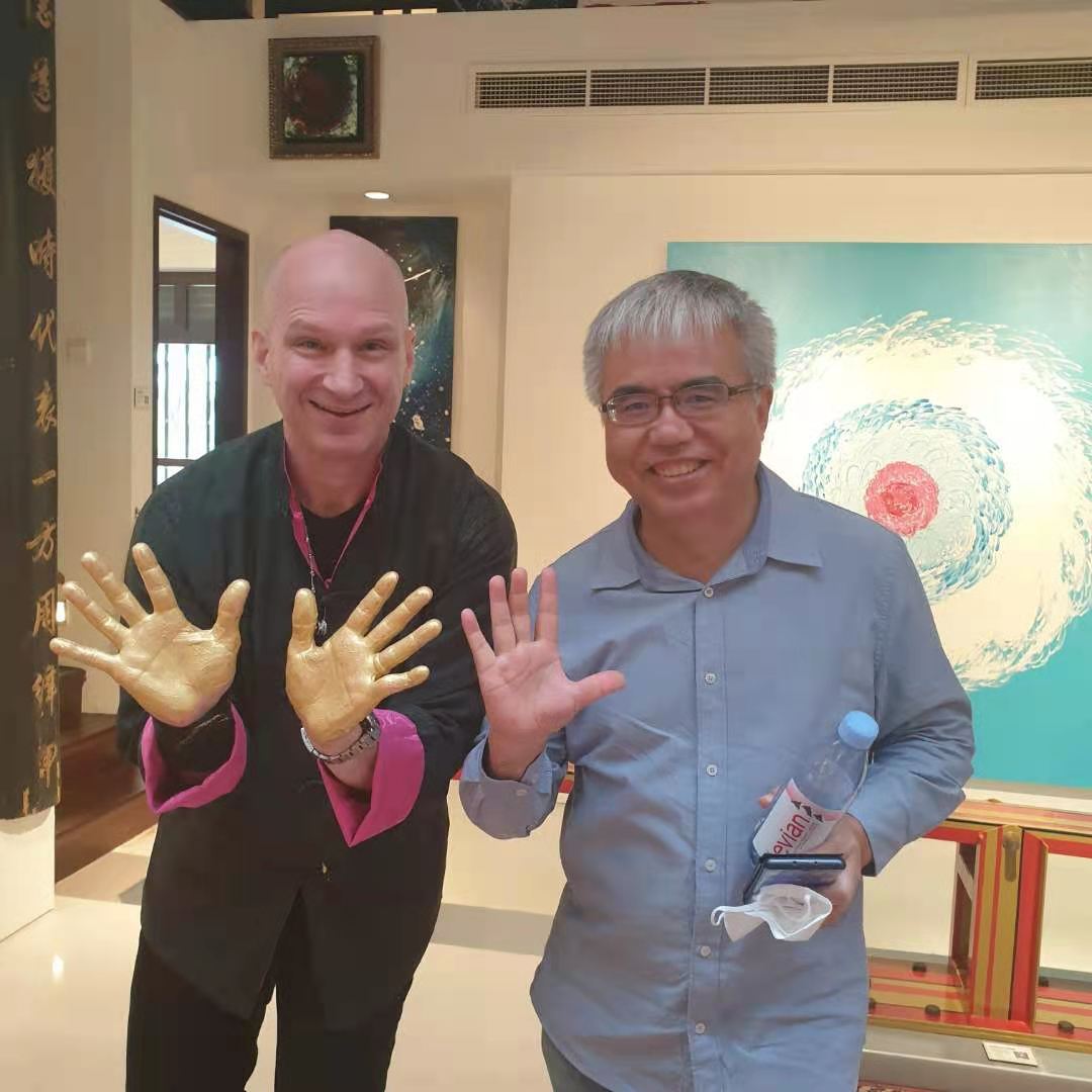 We visited Jan Larsen’s studio, which is also his gallery, Robertson House before the eve of Chinese new year. Upon entering into the gallery decorated by the artist himself, the yellow and gold painted walls filled the room with festive Chinese new year spirit. The bald and lanky artist who is standing in front of us is Jan Larsen. Wearing a Chinese Tang suit, he is also very knowledgeable and humble.