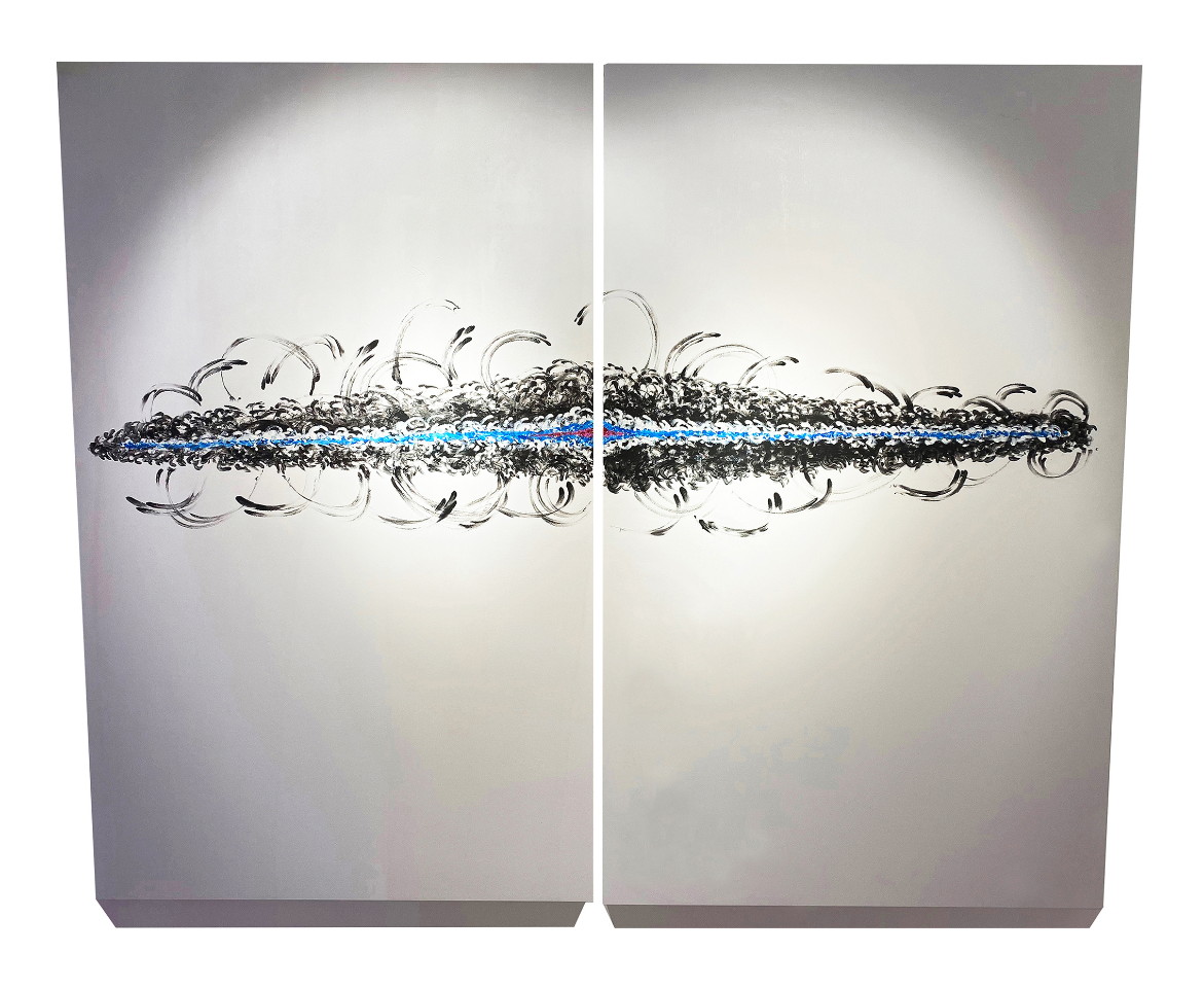 The second painting is in reference of his second “home” – Singapore and related to the first of painting. The art piece is made up of white red and black resembling the colours of the country flag. The colours represent mostly the same definitions but the only difference being the black strokes being packed closer together. This is spoken from the artist’s personal experience. He felt that in Singapore, People work closer to the society and with close and relevant ideas to build up the country. Whereas America is filled with people of more idealistic and individual idea and often with strong voices popping out from the society.