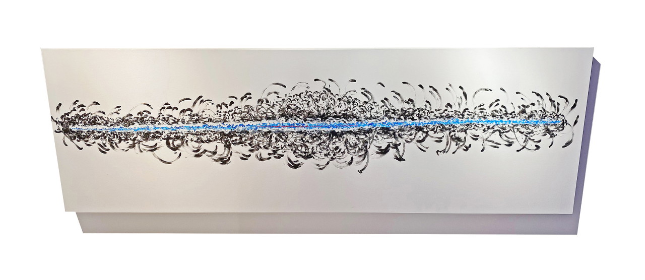 Entering the door of Robertson House, a black-and-white work is brought into view. The first painting is a presentation of the artist’s reflection towards his native-land, United States. The entire art piece is made up of 4 colours, white, blue, black and red. The strong and powerful black strokes represent many individuals and groups going separately in different direction towards their goals in life. They are all of unique thoughts and characters entering and exiting the society which is represented by white and blue. Lastly, the brightest colour-red representing humanity is surrounded by the many stokes and shades of the other colours suggesting that humanity is the society’s core.