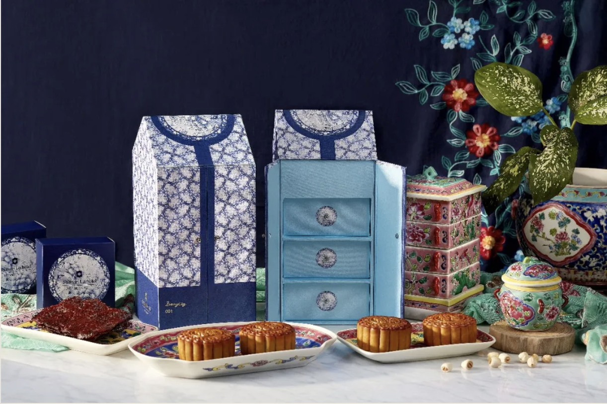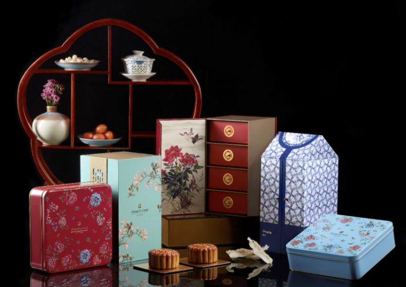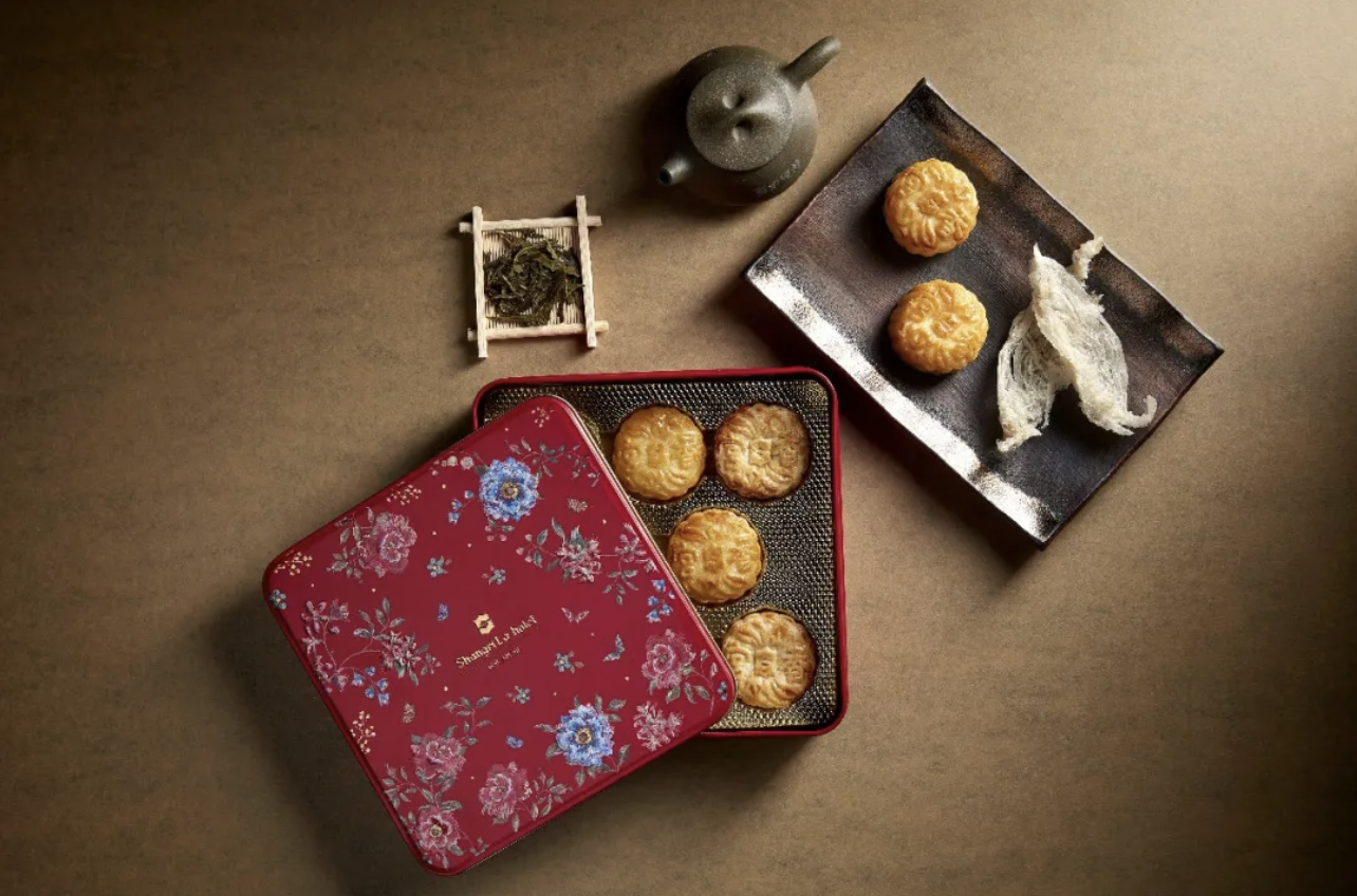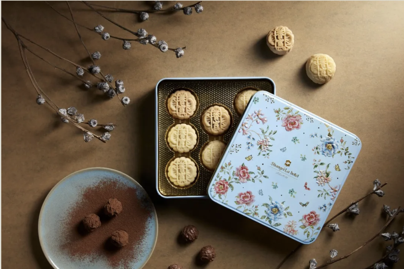 or those get-togethers with discerning traditionalists, bring baked mooncakes packed in a box that is either a nostalgic red or elegant turquoise. Both are patterned with flowers in full bloom to represent the bountiful harvest that the festival celebrates. The perennial favourite is the Shang Palace Four Treasures.